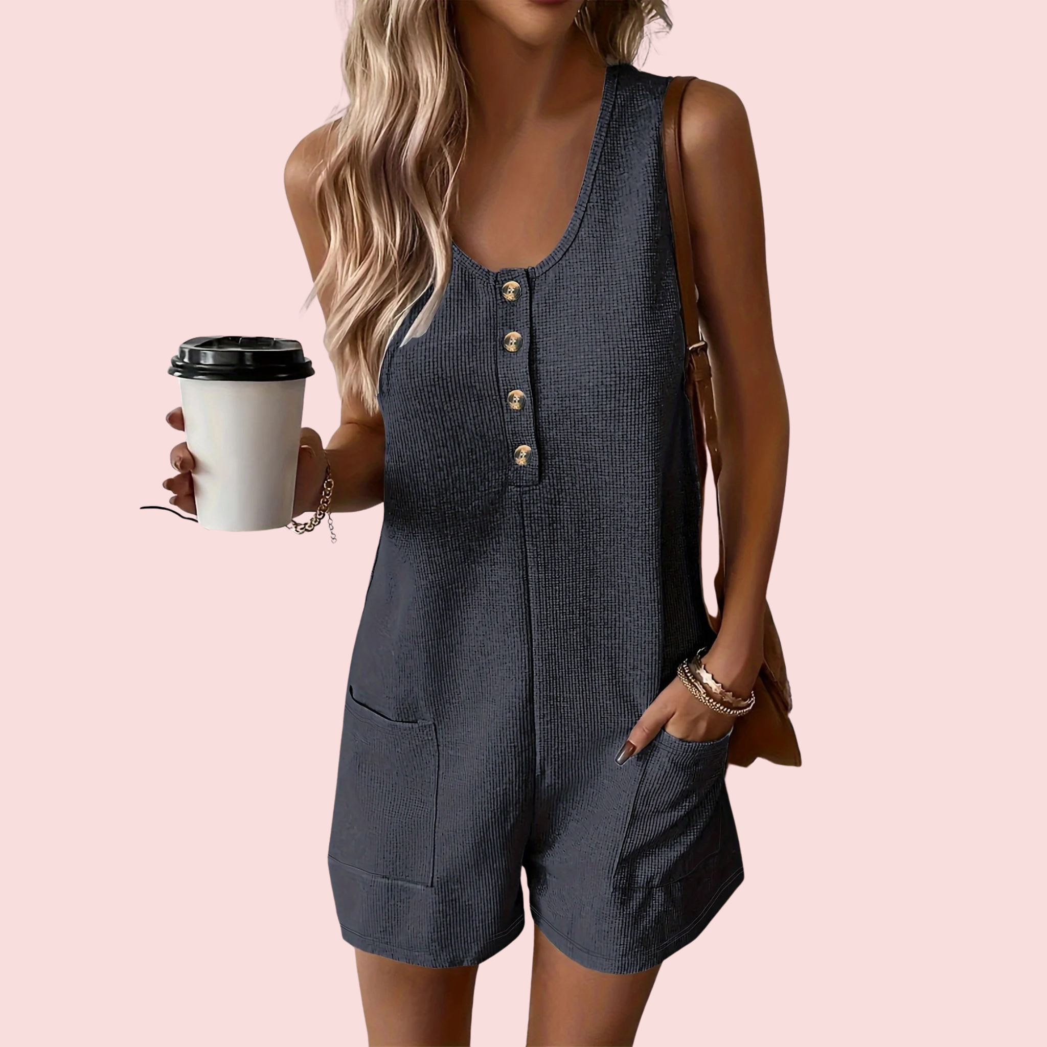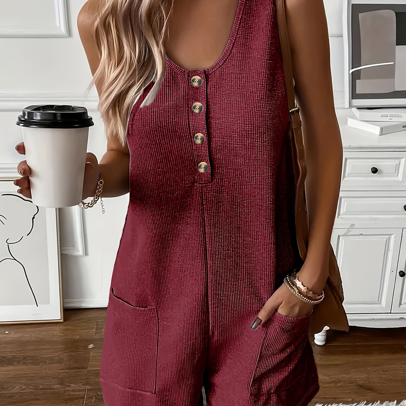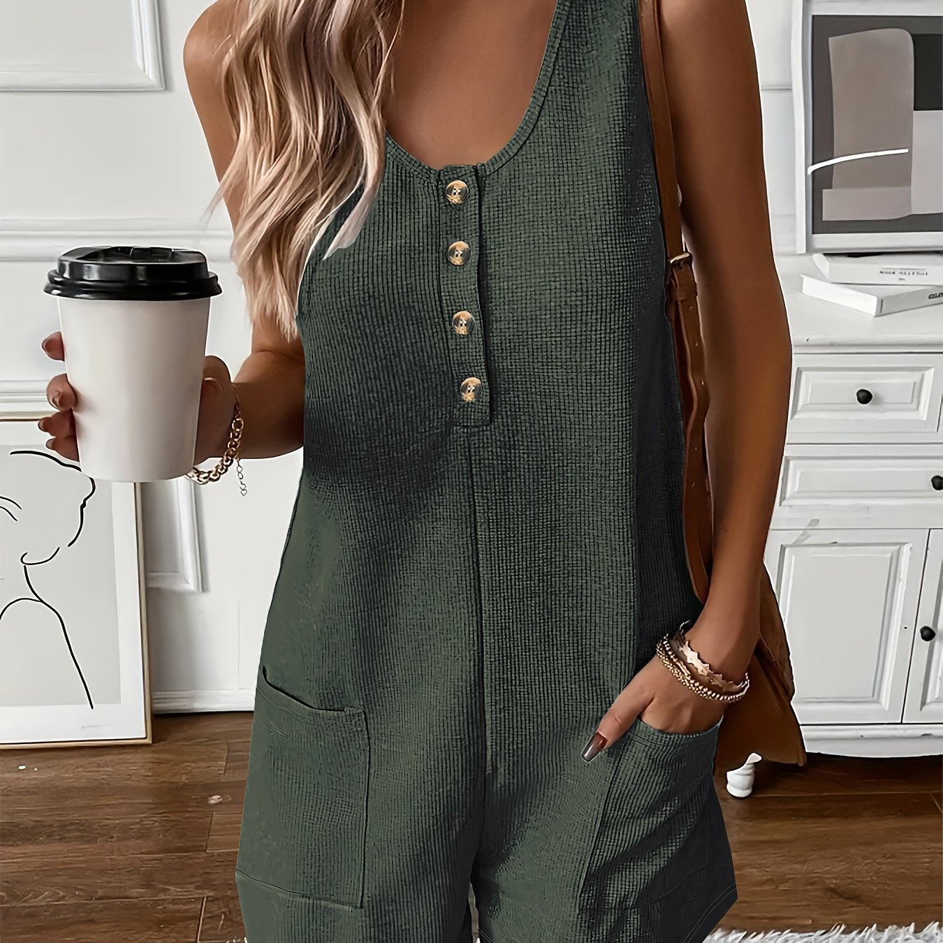 Deze mouwloze romper jumpsuit combineert comfort met functionaliteit. De knoopsluiting aan de voorkant geeft een modieuze touch, terwijl de handige zakken zorgen voor extra gemak tijdens warme dagen. Het effen kleurontwerp maakt deze romper veelzijdig en makkelijk te combineren voor elke casual zomerse look.