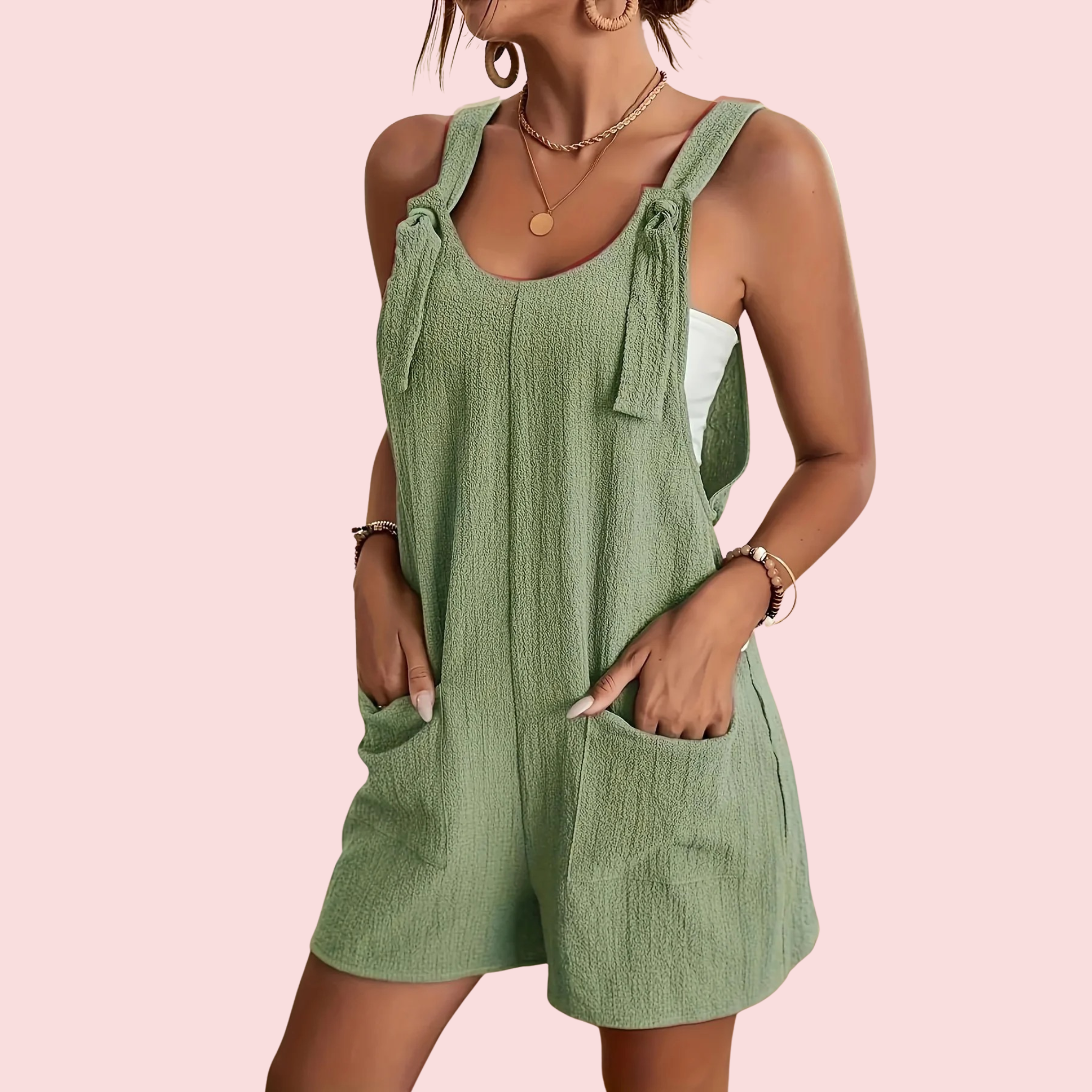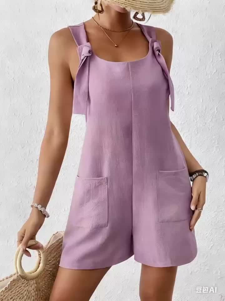 Deze olijfgroene mouwloze romper met een trendy kruisrug-ontwerp is perfect voor zomerse dagen en kan dankzij de gladde, duurzame stof het hele jaar door gedragen worden. De praktische zakken maken het gemakkelijk om essentials mee te nemen, terwijl de off-shoulder stijl een modieuze touch toevoegt. Gemaakt van 95% polyester voor een comfortabele en wasmachinebestendige pasvorm.