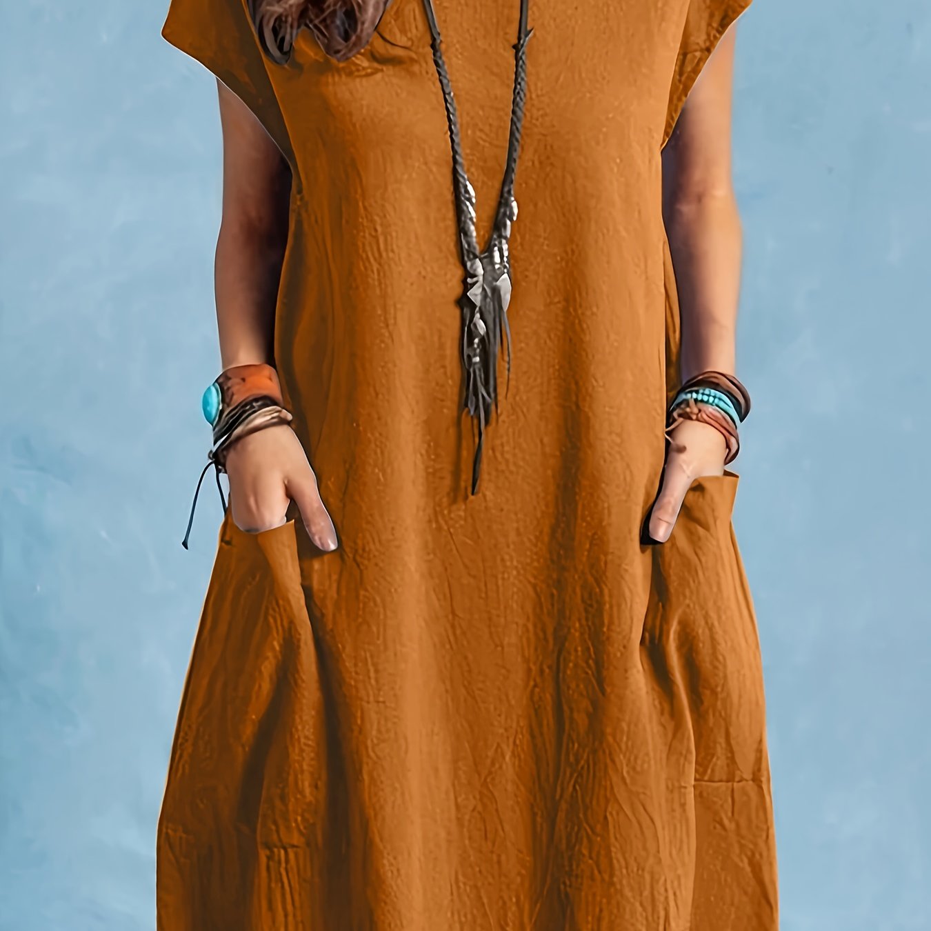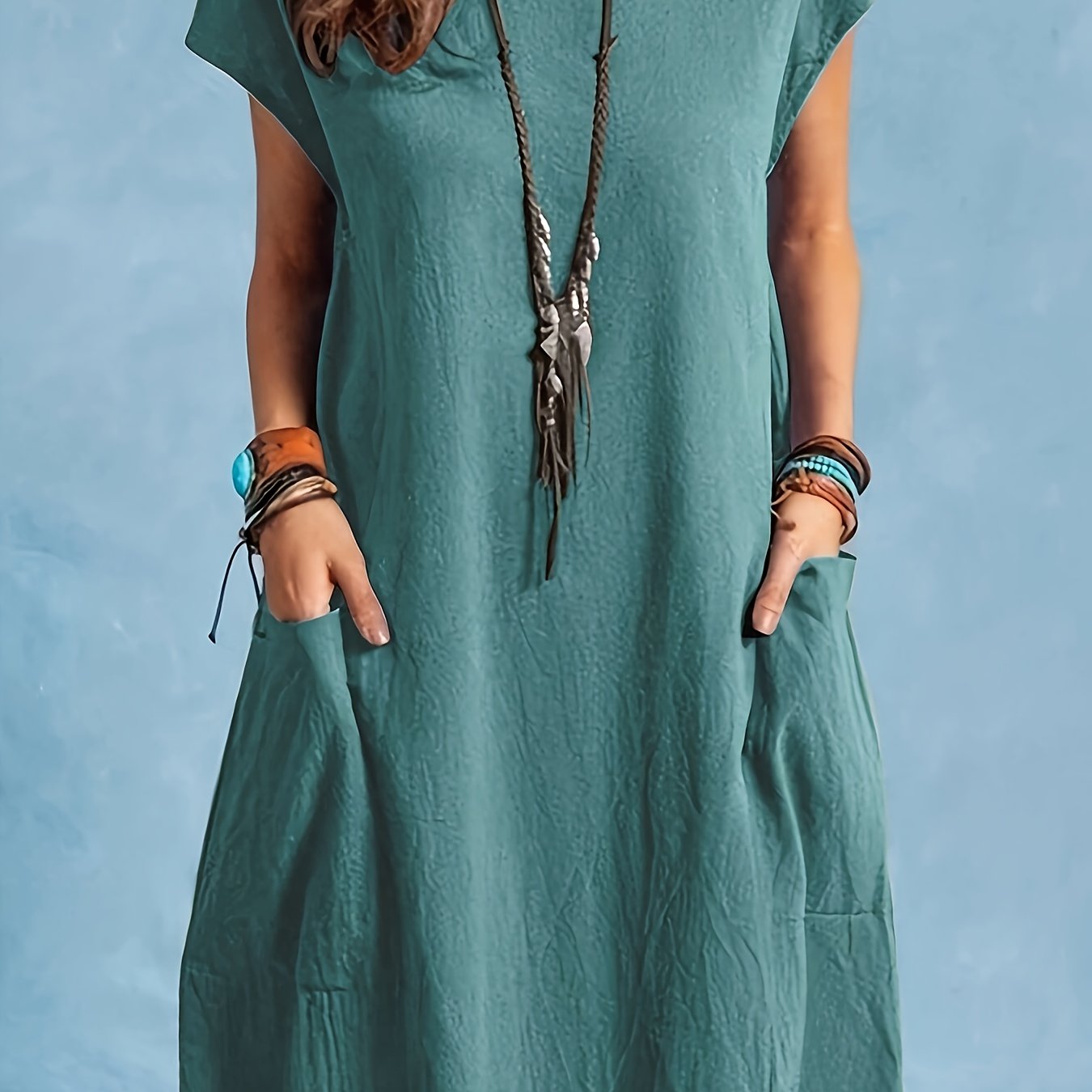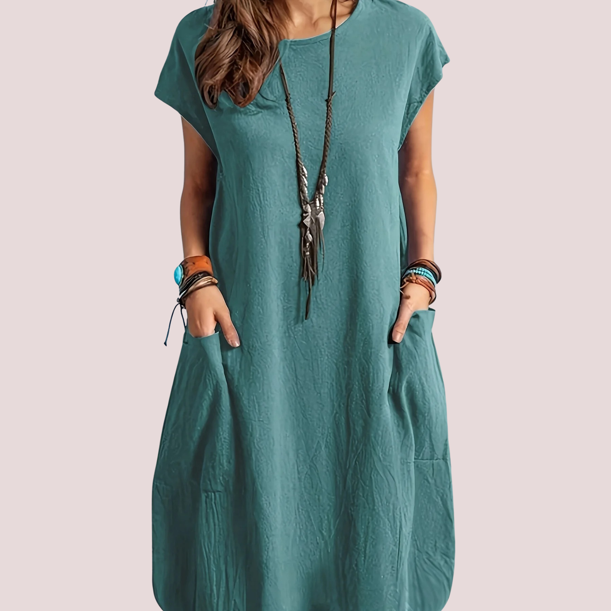 Deze elegante batwing mouw jurk combineert stijl en comfort moeiteloos. Met een zachte, casual ronde hals en een vloeiend A-lijn silhouet biedt de jurk een ontspannen pasvorm die perfect is voor lente- en herfstseizoenen. De dubbele zakken voegen functionaliteit toe zonder afbreuk te doen aan het verfijnde design. Gemaakt van een comfortabele, licht gestructureerde stof met een fijne textuur, is deze jurk ideaal voor casual dagelijks gebruik of een relaxte dag uit. Een veelzijdig kledingstuk dat moeiteloos kan worden gedragen van dag tot avond.