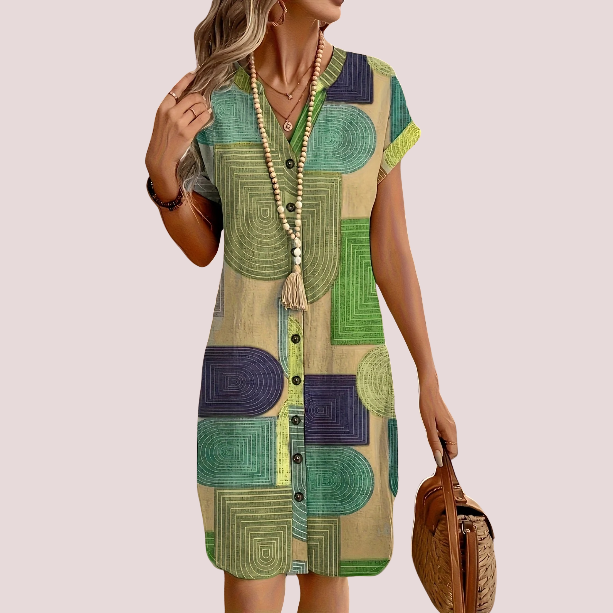 Stap moeiteloos over van werk naar feest met deze elegante V-hals jurk voor dames. Uitgevoerd in duurzaam polyester met een verfijnde niet-rekbare stof, biedt deze jurk een perfecte balans tussen comfort en stijl. De ruime batwing mouwen zorgen voor een modieuze en comfortabele pasvorm, terwijl het subtiele geometrische patroon een eigentijdse touch geeft aan je look. Ideaal voor lente- en zomerbijeenkomsten, combineert deze jurk zakelijke elegantie met casual flair. Een veelzijdige must-have die je garderobe naar een hoger niveau tilt.