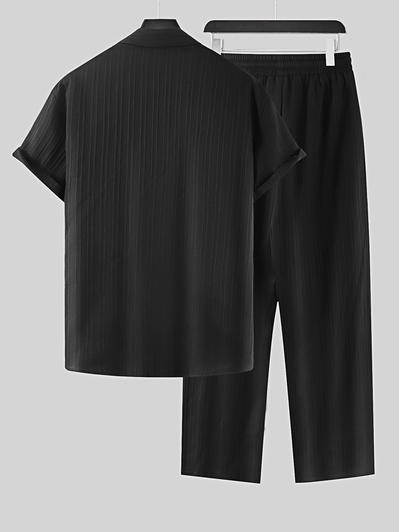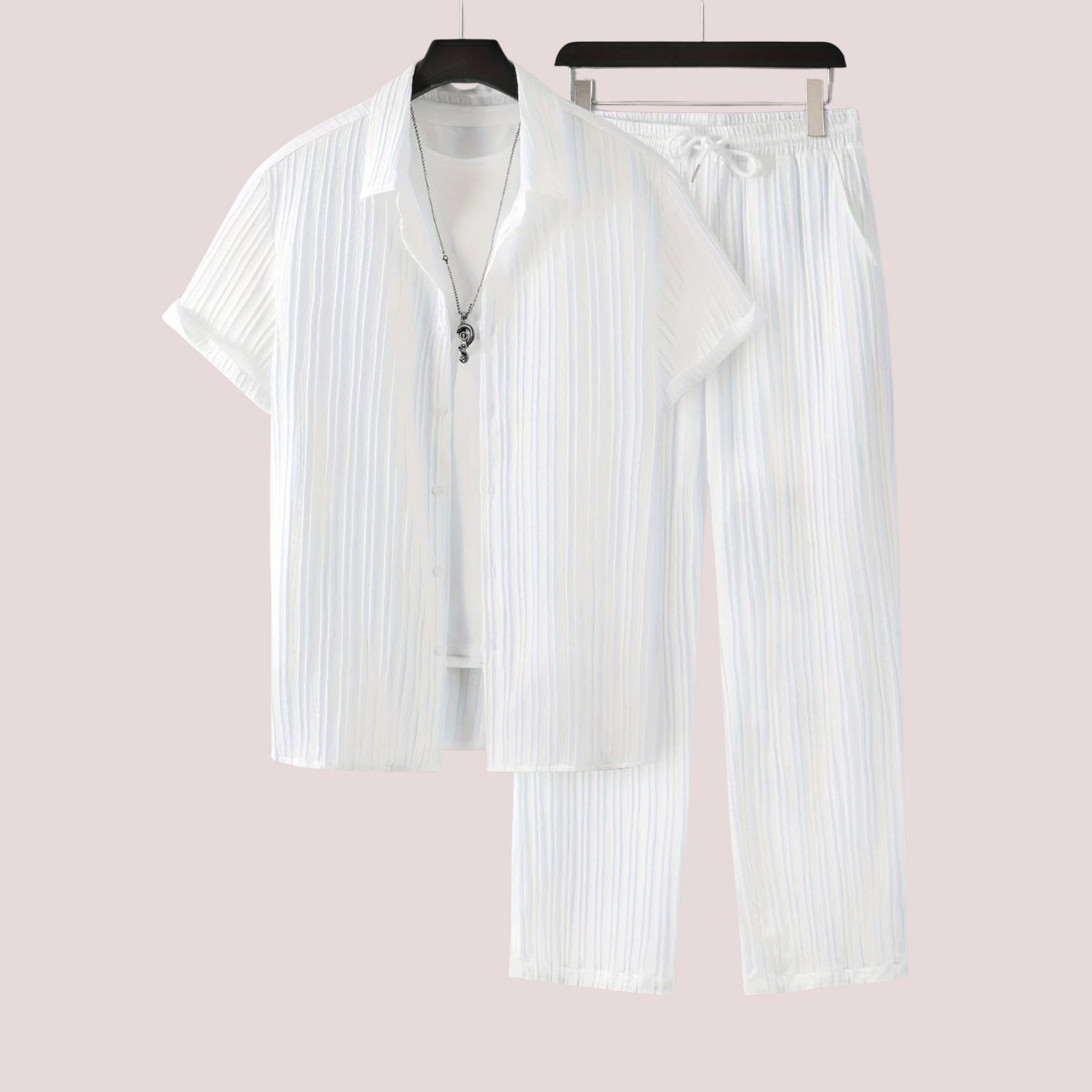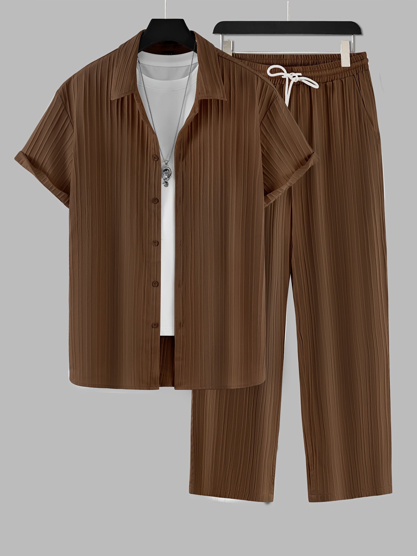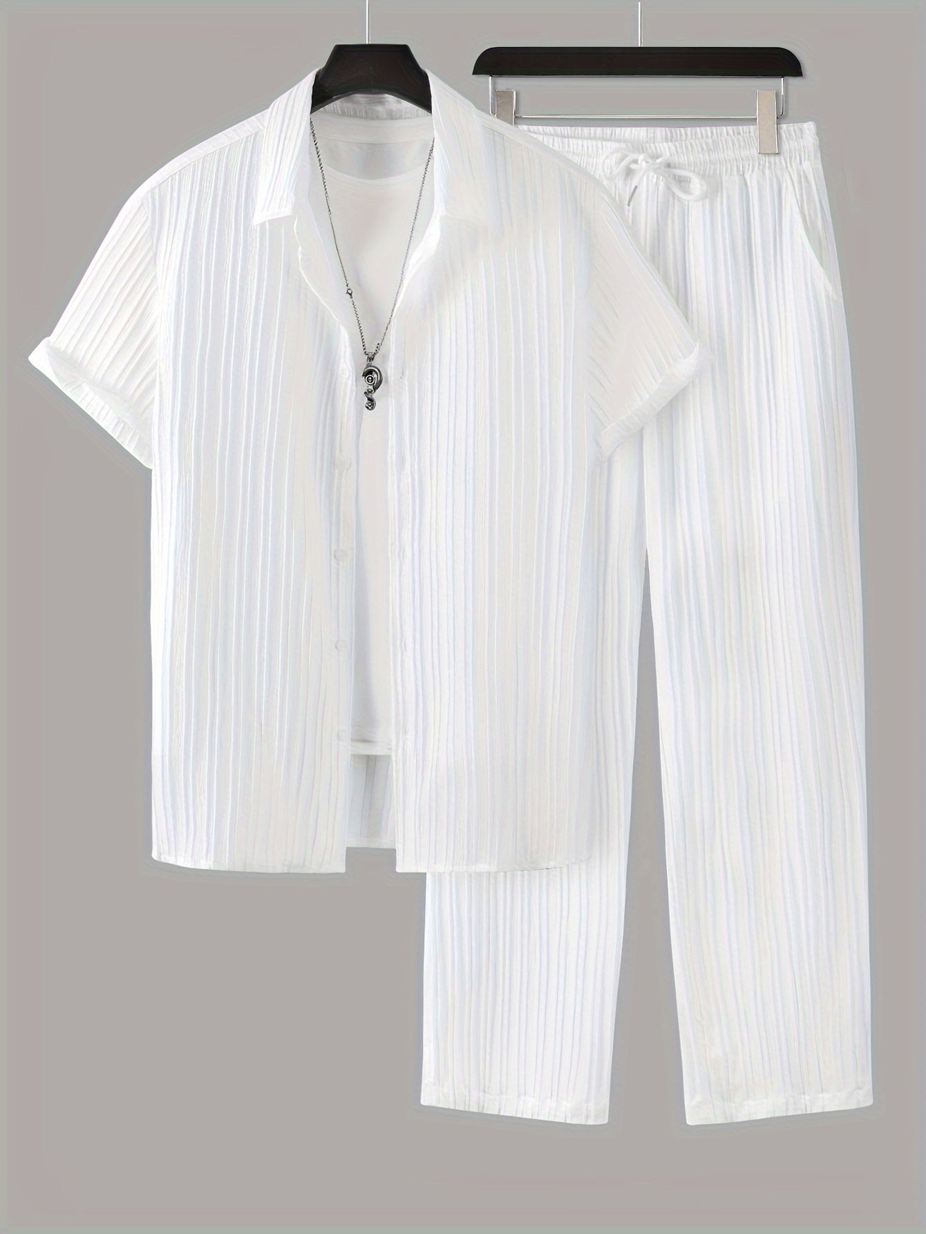 Geniet van ultiem comfort en stijl met deze grote maten heren zomerset. Deze 2-delige outfit bestaat uit een casual korte mouwen overhemd met een stijlvolle omslagkraag en een bijpassende broek met trekkoord voor een verstelbare pasvorm. Gemaakt van ademende, lichte stof, perfect voor warme dagen. Ideaal voor dagelijks gebruik, een strandvakantie of ontspannen uitjes. Verkrijgbaar in zowel effen kleuren als gestreepte patronen.