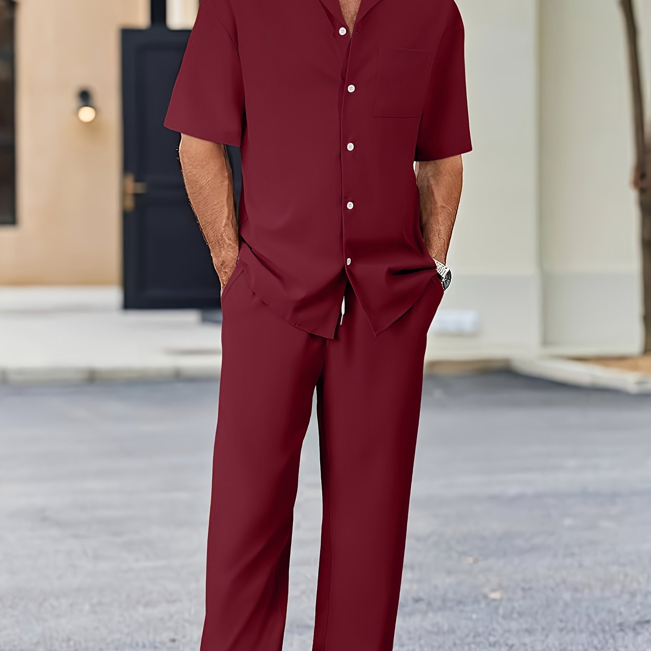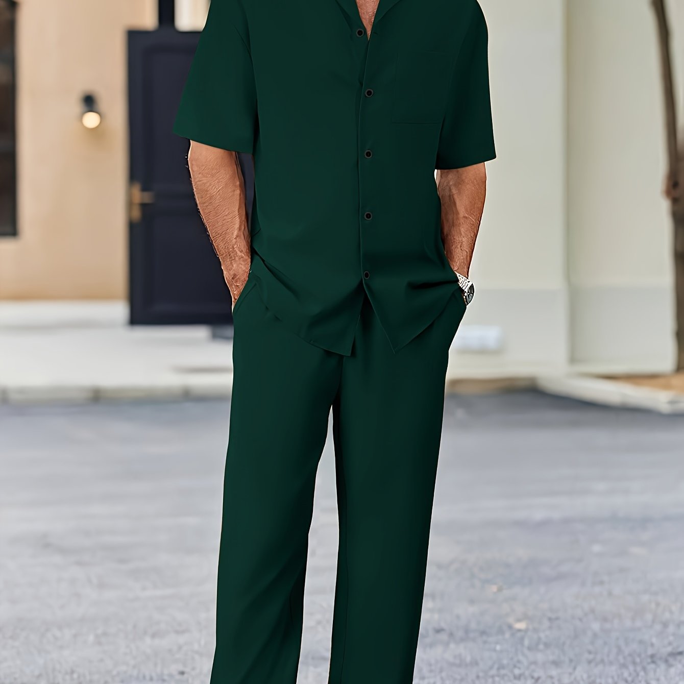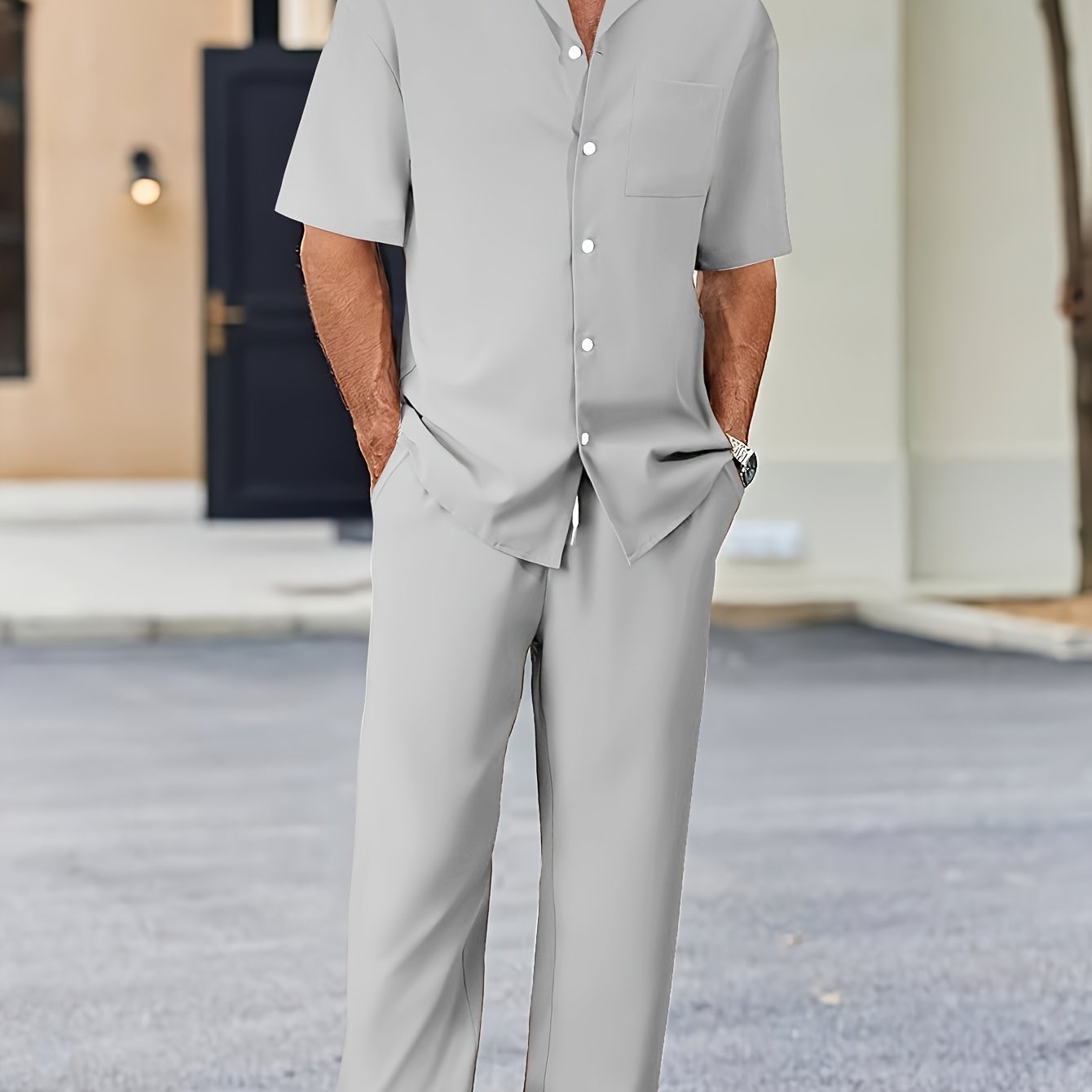 Deze stijlvolle heren set combineert een pak-geïnspireerd korte mouwen overhemd met een losse, rechte broek voor ultiem draagcomfort. Gemaakt van duurzaam polyester en eenvoudig machinewasbaar. Perfect voor casual dagen, zomerse uitjes en ontspannen vakanties.