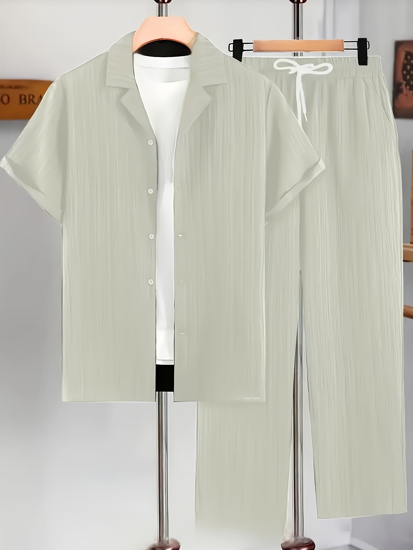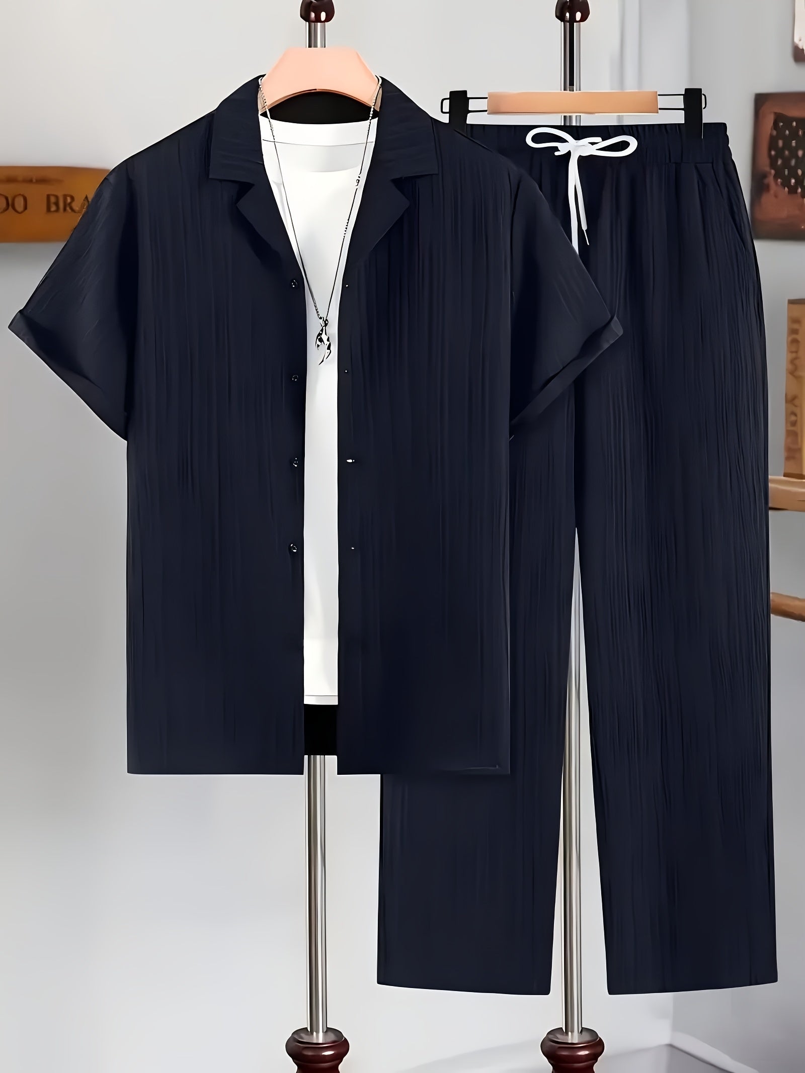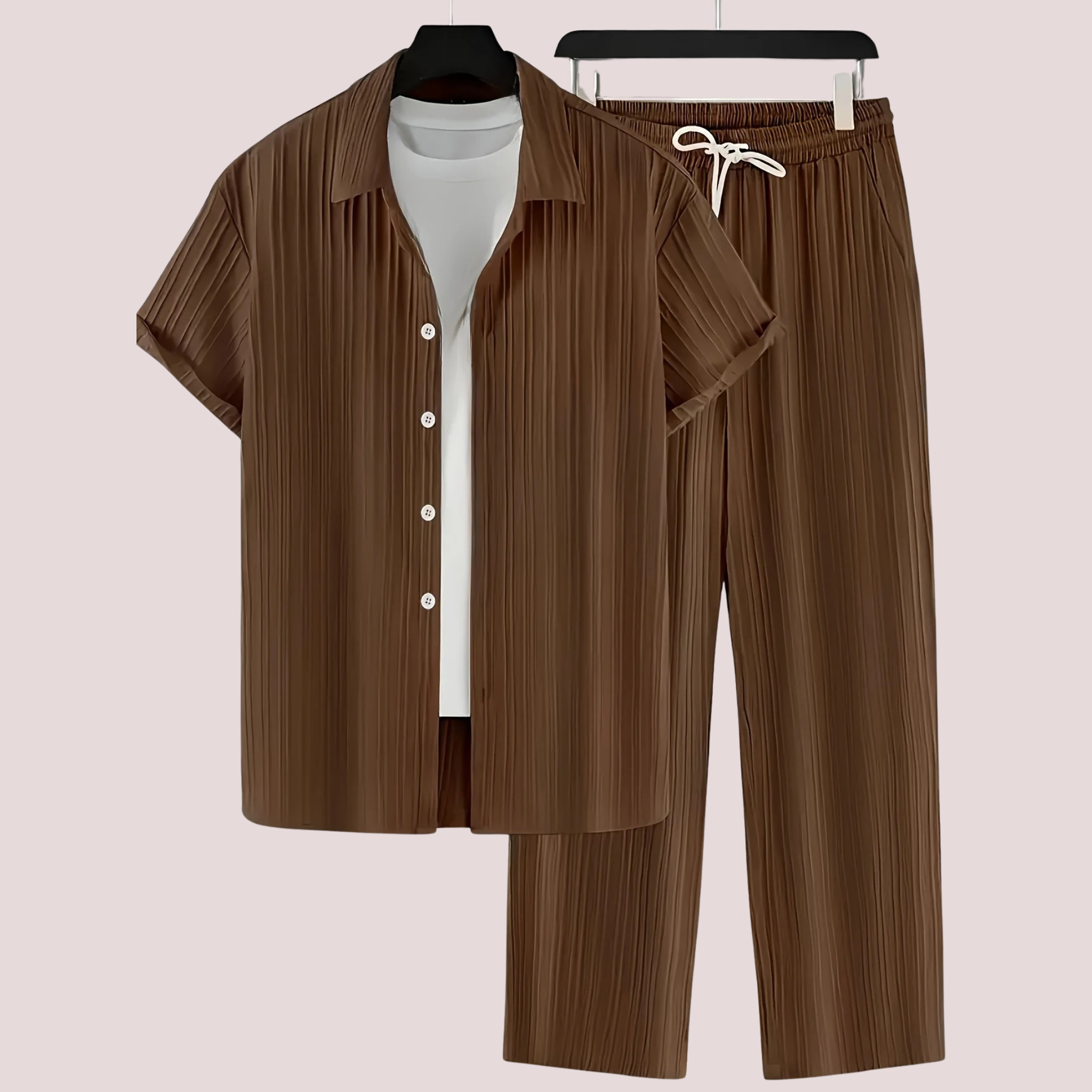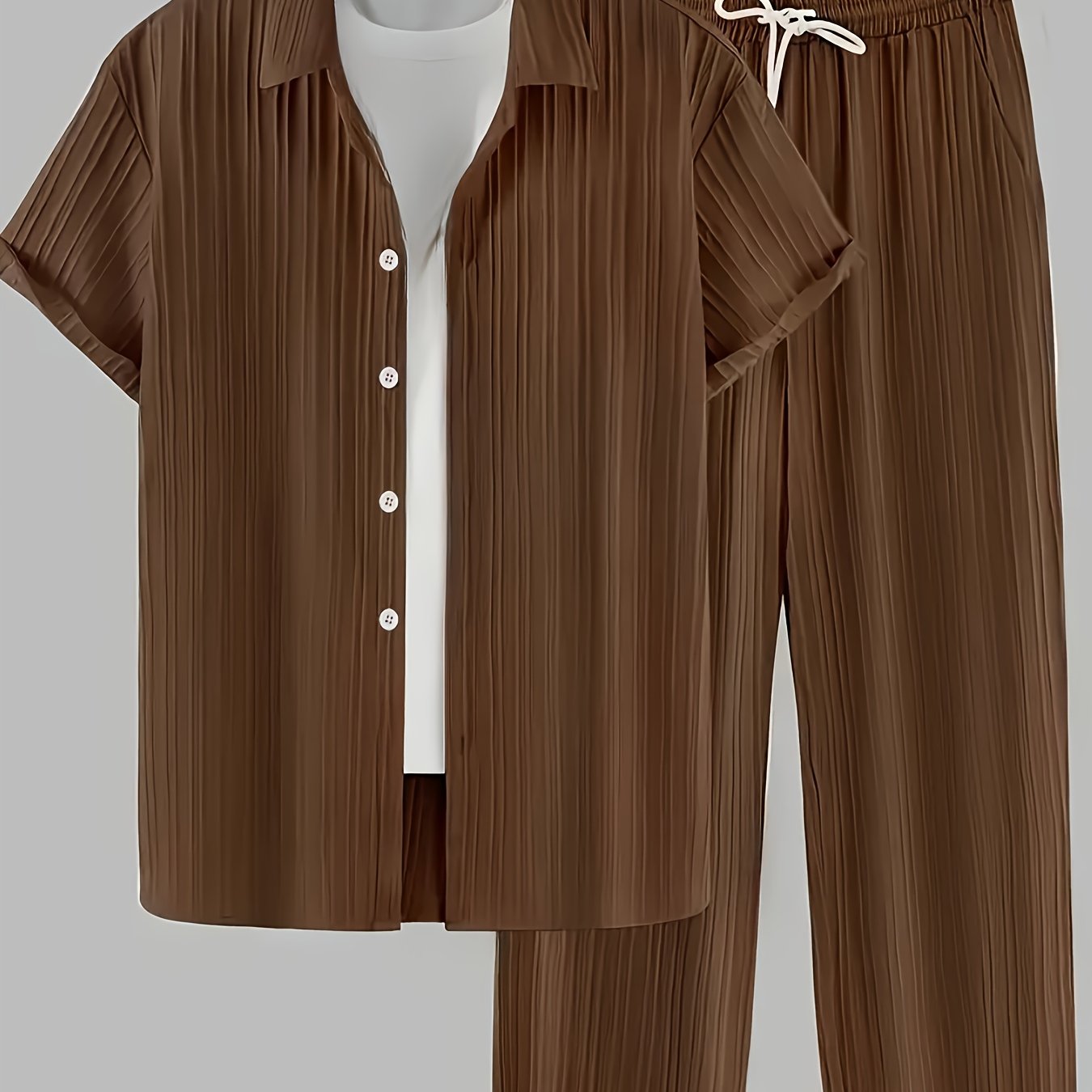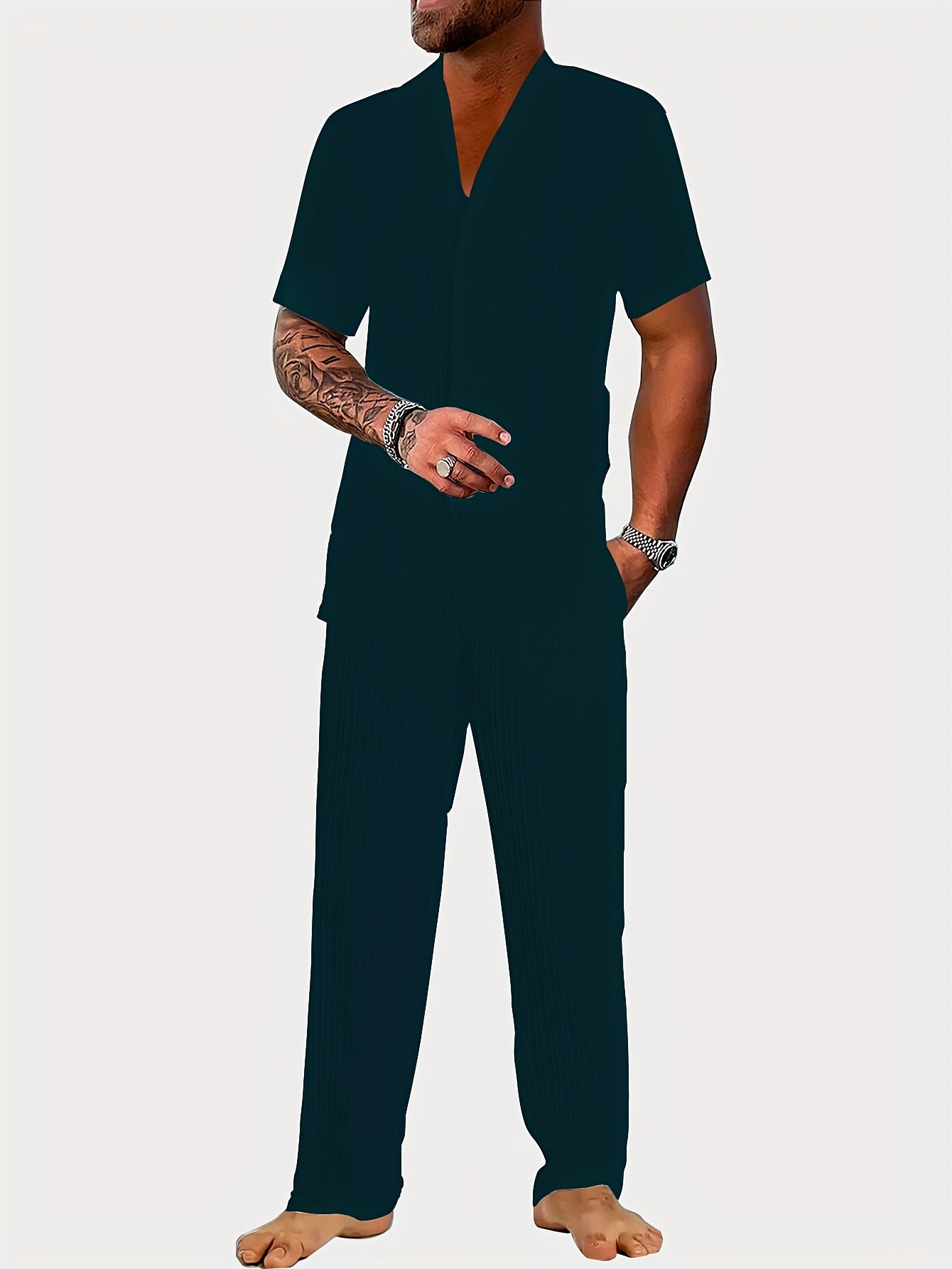 Deze heren vrijetijdsset combineert stijl en comfort in één. Het korte mouwen vest met omgeslagen kraag straalt een ontspannen, maar modieuze look uit. De bijpassende broek zorgt voor een complete, gecoördineerde outfit die perfect is voor thuis, vrije tijd of een casual uitje. Het gestreepte ontwerp geeft een trendy touch, terwijl de luchtige stof zorgt voor draagcomfort in warme seizoenen.