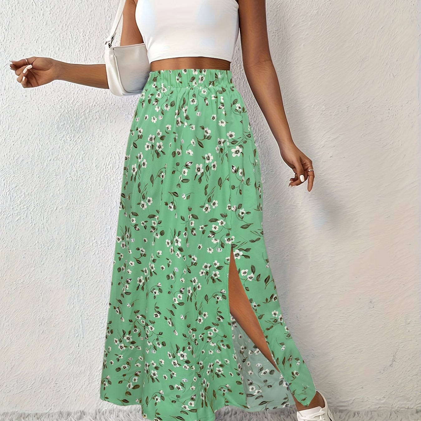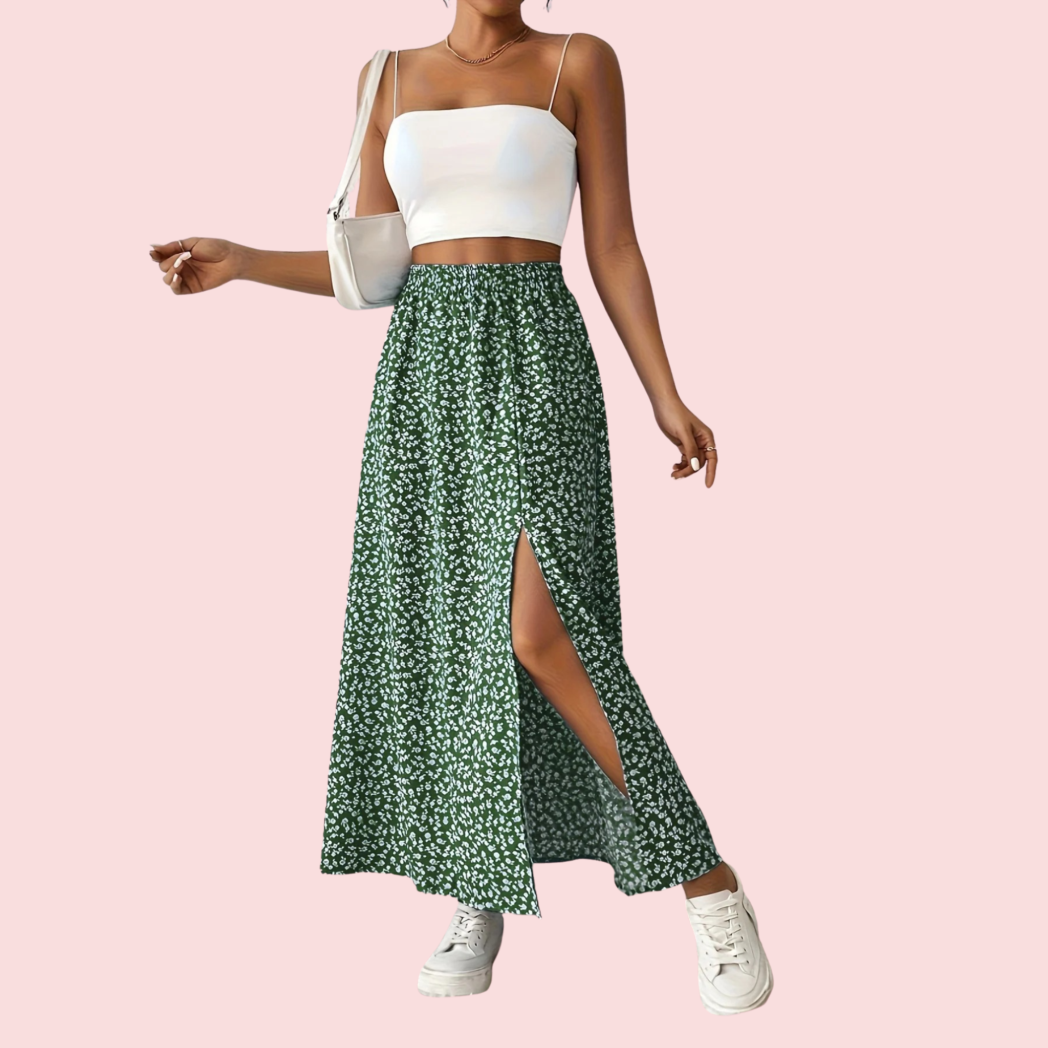 Voeg een frisse, natuurlijke touch toe aan je garderobe met deze maxi rok, uitgevoerd in een levendige groene bloemenprint. Gemaakt van 95% polyester, met een flatterende hoge taille en een zijdelingse spleet voor extra bewegingsvrijheid en een speelse uitstraling. Perfect voor zomerse dagen en elegante gelegenheden.