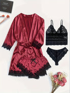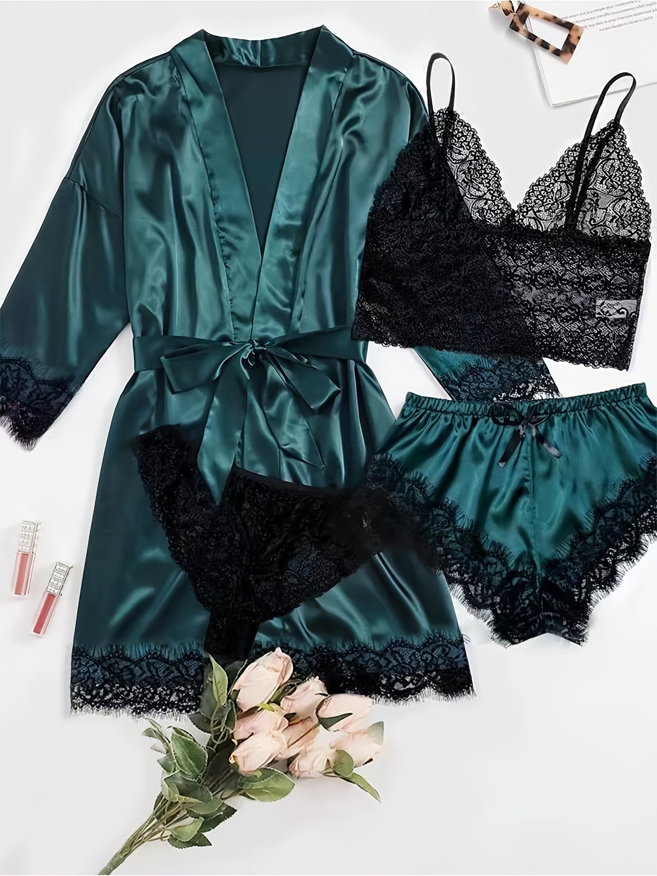 4-delige satijnen lounge set voor dames met contrasterende kanten details | Driekwart mouw badjas met riem, cami bra, slipje, elastische shorts, ronde hals, effen kleur, alle seizoenen