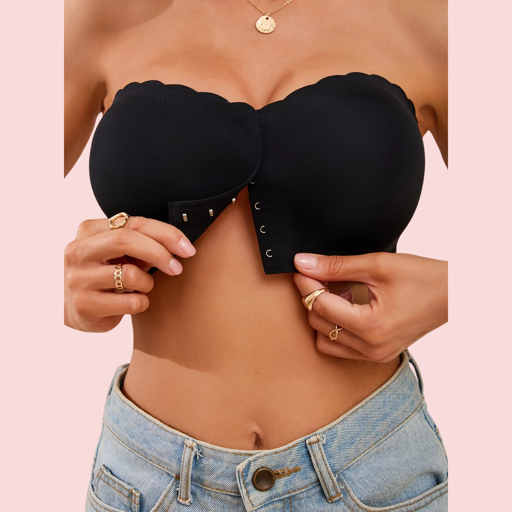Ervaar ultiem comfort én een perfecte pasvorm met deze beugelloze BH met voorste sluiting. Dankzij het naadloze design en de onzichtbare banden draag je hem moeiteloos onder elke outfit. De extra voering en push-up functie zorgen voor een mooie, natuurlijke vorm, terwijl de verwijderbare straps flexibiliteit bieden: draag hem met of zonder bandjes, precies zoals jij wilt.