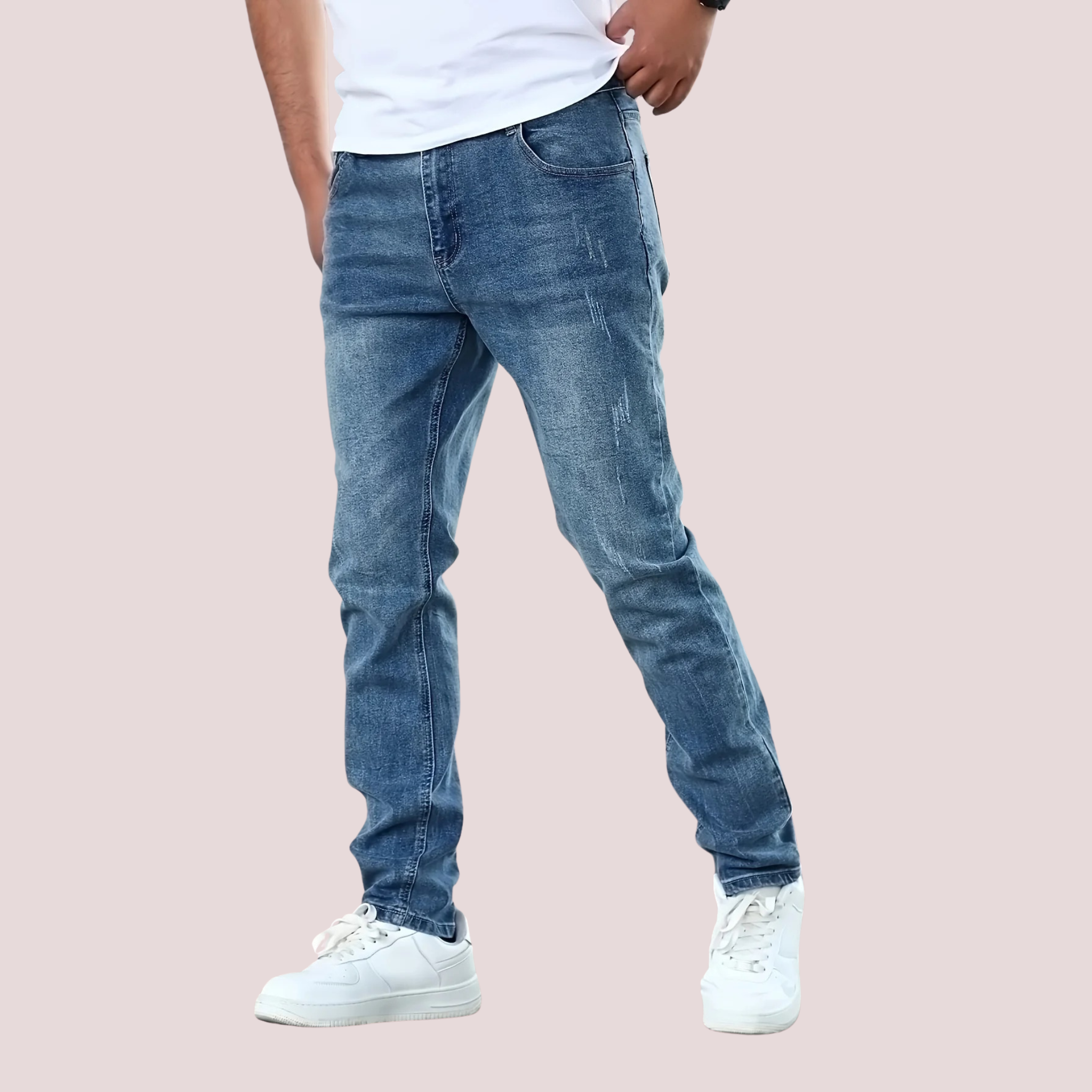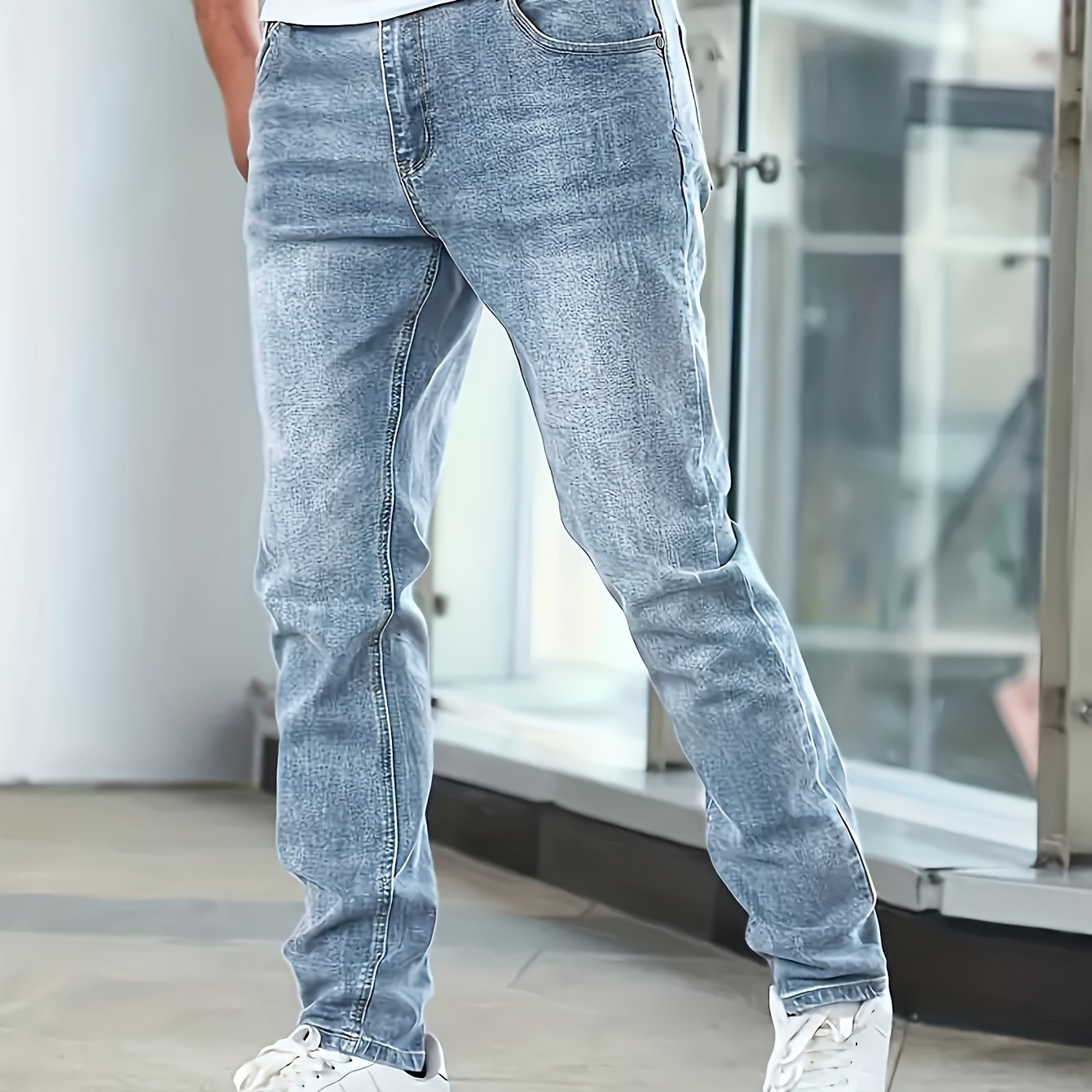 Deze heren slim-fit denim jeans combineert stijl en comfort met een casual look. Gemaakt van lichtblauwe stretch denim met een gewassen afwerking, biedt deze broek een normale pasvorm die perfect is voor dagelijks gebruik in alle seizoenen. De effen kleur en het duurzame geweven denim maken het een veelzijdige keuze, ideaal voor tieners en mannen die een moderne casual stijl willen.